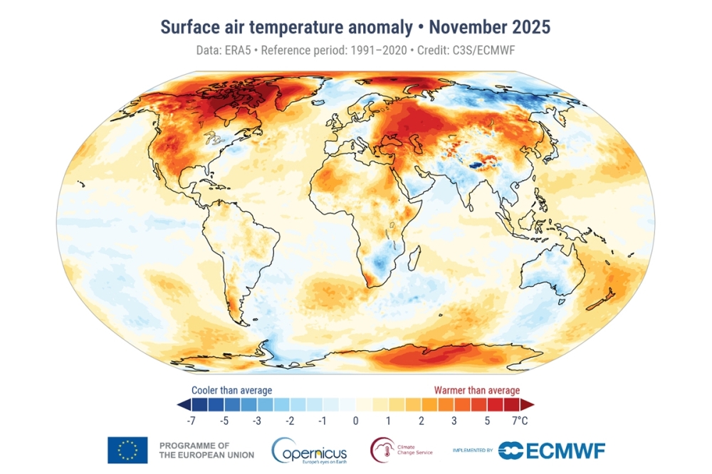 وأوضحت الوكالة في تقريرها الشهري الصادر اليوم الثلاثاء أن العام الحالي يتساوى حاليا مع عام 2023 كثاني أكثر الأعوام حرارة، خلف عام 2024. وأضافت أن الشهر الماضي كان ثالث أكثر نوفمبر دفئا على الإطلاق، إذ بلغ متوسط درجة الحرارة العالمية 14.02 درجة مئوية، مع تسجيل قراءات مرتفعة بشكل استثنائي في مناطق مثل المحيط المتجمد الشمالي.