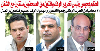 ـ فى خامس قضية حبس لرئيس تحرير فى مصر، قضت أمس محكمة جنح مصرية ، بحبس أنور الهواري رئيس تحرير صحيفة الوفد ومعه نائب رئيس التحرير ومحرر بالقسم السياسي سنتين مع الشغل لكل منهم، وكفالة 5 آلاف جنيه لوقف تنفيذ عقوبة الحبس ، وذلك فى القضية التى رفعها 11 محاميا ينتمون إلي الحزب الوطني الحاكم ضد الصحفيين الثلاثة بعد قيام الوفد بنشر وقائع اجتماع الذي حضره وزير العدل في اللجنة التشريعية بمجلس الشوري يوم 26 يناير الماضي، وتناول فيه التقديم لتعديلات قانوني العقوبات والإجراءت الجنائية، ووجه انتقادات إلي بعض القضاة بالمحاكم الابتدائية.