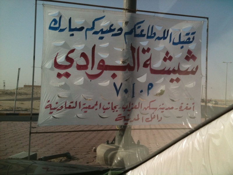 أرسل لنا القارئ أحمد الشمري الصورة المرفقة التي التقطها صباح اليوم بالجهراء، وهي لإعلان بالشوارع عن مقهى شيشة. القارئ ذكر في رسالته أن كثيرا من المهنئين تملأ لوحاتهم ولافتاتهم شوارع ودوارات الجهراء، ولكنه التقط هذه الصورة فقط التي سماها 'عيدكم شيشه'، فكانت كاميرا
