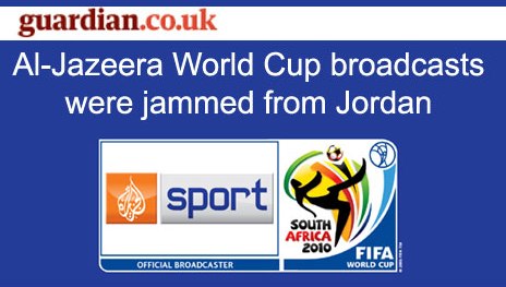 أوردت صحيفة غارديان البريطانية الواسعة الانتشار أن التشويش الذي حدث على قنوات الجزيرة الرياضية خلال تغطيتها لكأس العالم الأخيرة 2010 بجنوب أفريقيا ، تم تعقبه واكتشف أن مصدره الأردن.