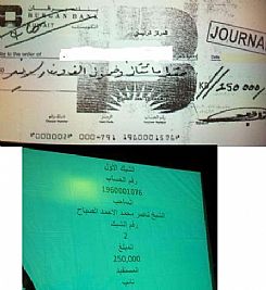 قبل شهر تقريبا، تداولت بعض صفحات التواصل الإجتماعي، وخاصة 'التويتر'، صورة ضوئية لشيك بقيمة 250 ألف دينار كويتي، موقع لصالح أحد نواب الدائرة الإنتخابية الخامسة، ولكن النائب المقصود سرعان ما نفى علاقته بالشيك، وإدعى حينها ان الشيك مزور، وهدد بمقاضاة من نشر الشيك.