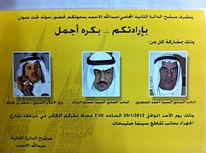 يقيم مرشح الدائرة الثانية المحامي / عبدالله الأحمد ندوة في تمام الساعة السابعة والنصف من مساء اليوم الأحد تحت عنوان 'بإرادتكم ..بكرة أجمل' ، بمشاركة كل من النائب السابق ومرشح الدائرة الثالثة أحمد السعدون والنائب السابق ومرشح الدائرة الرابعة مسلم البراك ووزير الإعلام السابق د.سعد بن طفلة العجمي ،وذلك في مقره الكائن في غرناطة شارع الجهراء بجانب تقاطع سينما الصليبيخات.