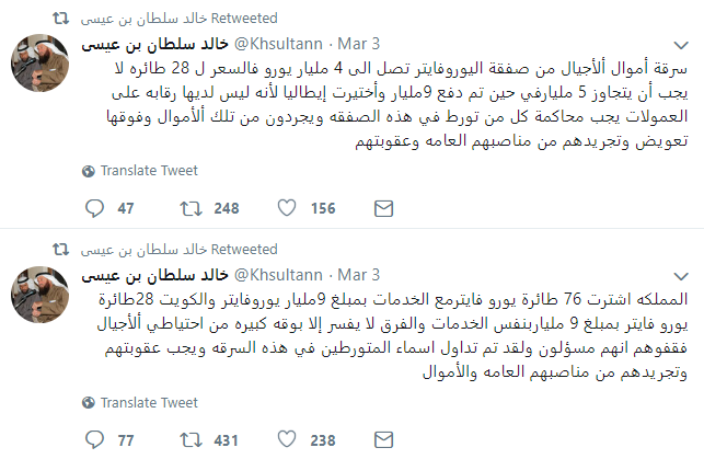 #جريدة_الآن خالد سلطان بن عيسى عبر تويتر : بوقة كبيرة في صفقة طائرات اليوروفايتر